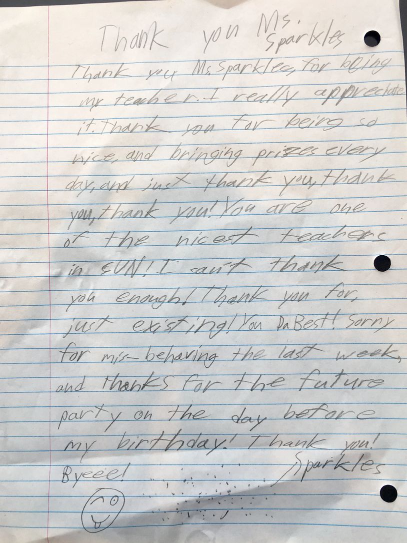 ...you were the favorite Sun teacher! The kids loved your Arts & Crafts Class so much that we had to have a lottery. Thanks for all that you've done for the kids."